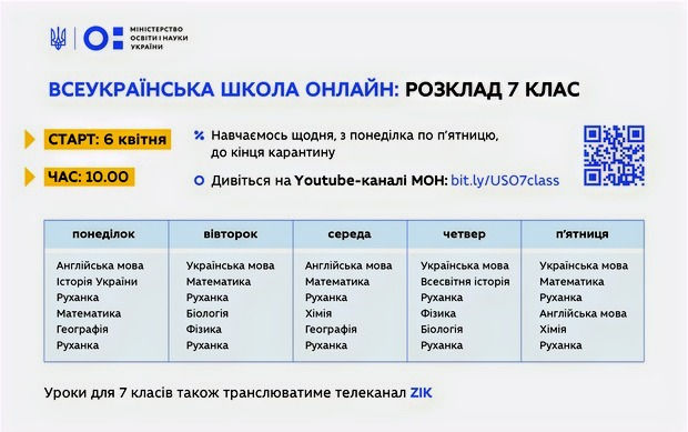 6 квітня 2020 року, на YouTube-каналі МОН, а також ще на 15 телеканалах та медіаресурсах о 10:00 розпочнеться трансляція уроків для учнів 5-11 класів на карантині.